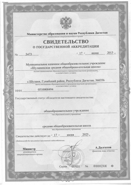 | Адрес местонахождения образовательной организации* | 368356, республика Дагестан, Гунибский район, село Щулани |